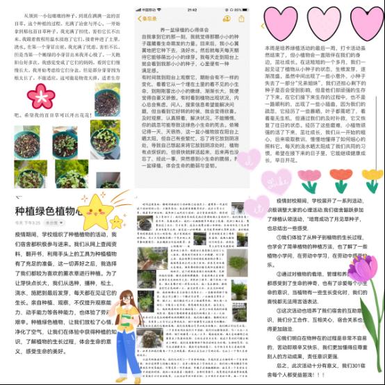 本次“绿植领养”活动实现线上线下紧密融合互动,学生参与热情高涨、反响热烈。活动开始,因为受疫情形势严峻的影响,种植条件有限,同学们自己带着小铲子在学校的花坛边、松树下挖土,用吃过的外卖盒和剪断的饮料瓶底做花盆。怀着忐忑而又虔诚的心情种下种子,浇水、晒太阳、拍照、记录打卡几乎成了同学们每天的“必修课”。交流群里常常是这一方请教取经,虚心学习,那一方交流共享,共同提高,互帮互助的友爱氛围蔚然成风。 在大家的悉心照料下,整个校园线上线下,绿意盎然,花草葱郁,一派生机。