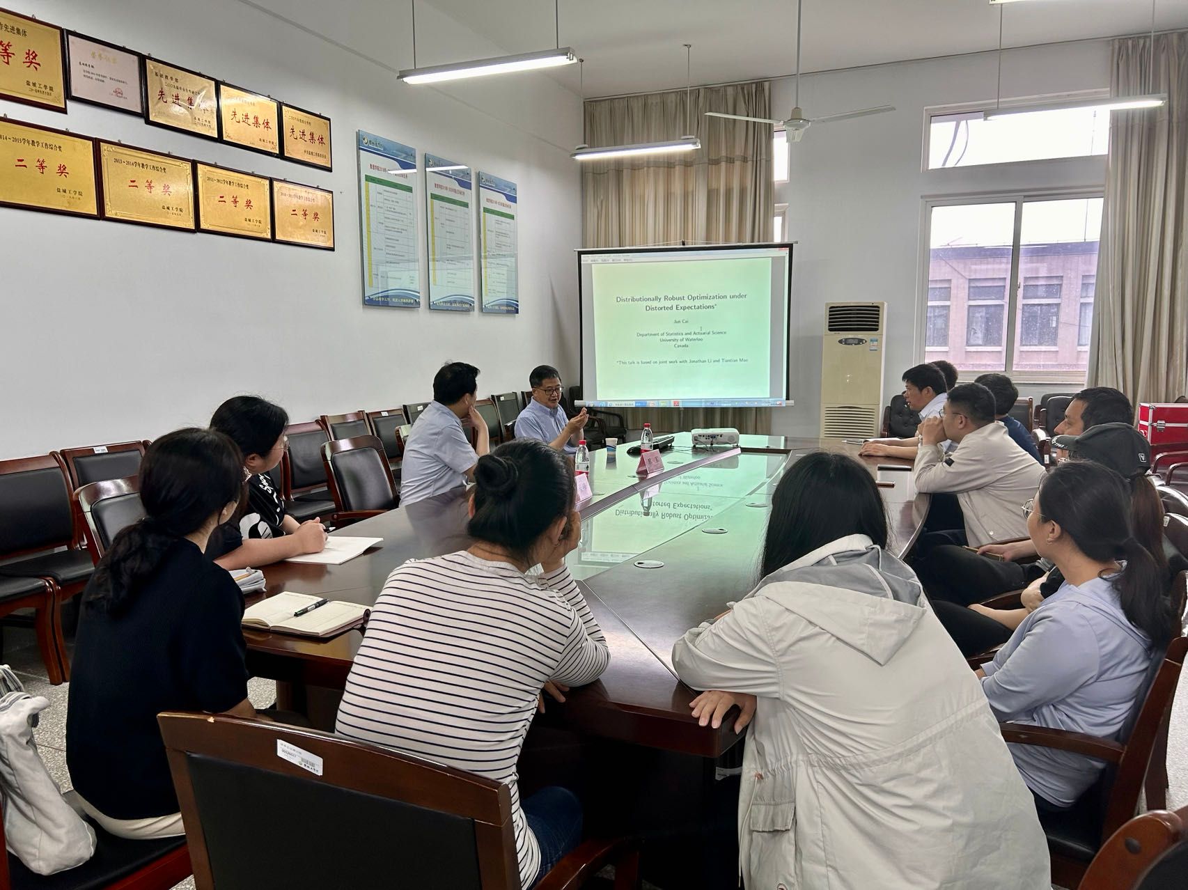 6月25日下午,应数理学院邀请,国际著名精算专家、加拿大滑铁卢大学蔡军教授在数理学院B512会议室作了题为“Distributionally Robust Optimization under Distorted Expectations "的讲座,讲座由数理学院院长薛长峰教授主持。学院统计与数据科学系的全体教师以及基础数学系和应用数学系的部分教师聆听了讲座。