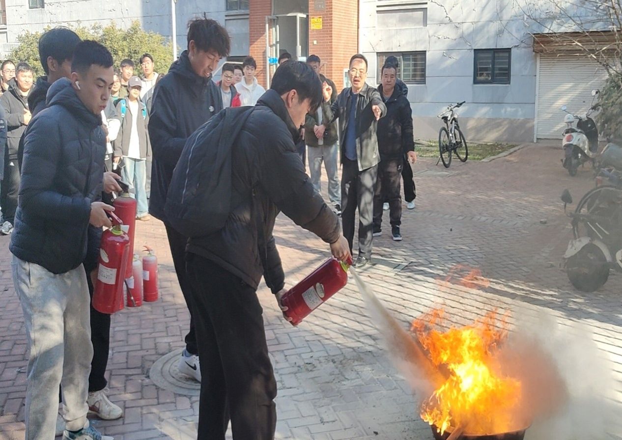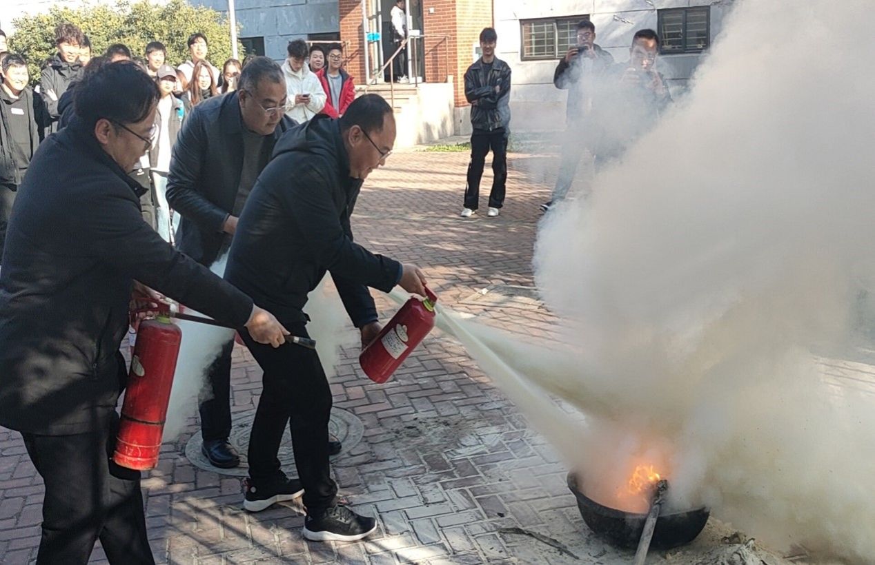 公开课结束后,全体人员在学生宿舍27号楼进行了消防实地演练。学校保卫处负责同志现场讲解了灭火器的构造、使用方法及注意事项等,并指导师生代表进行实践操作。