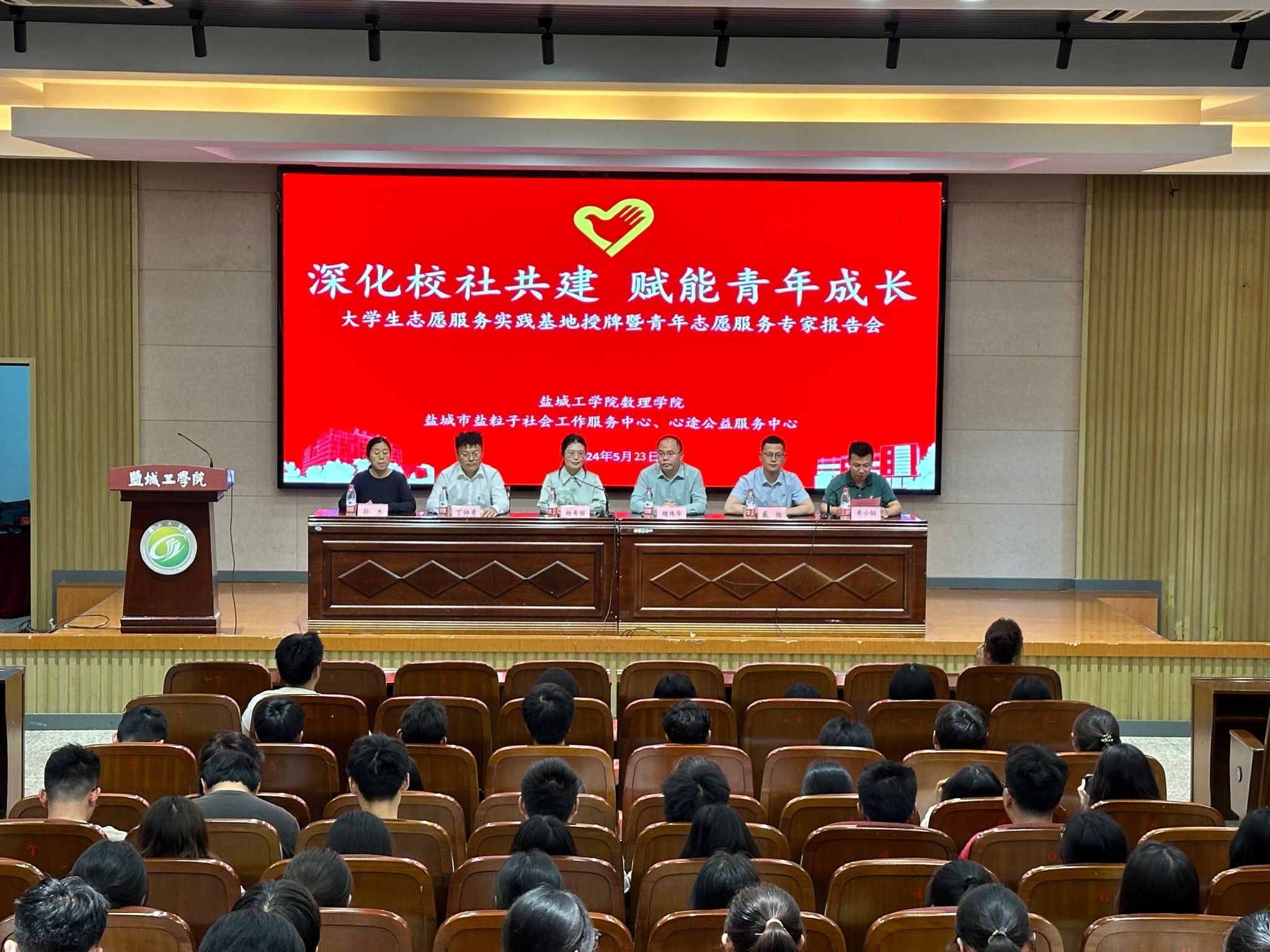 为深化志愿服务育人工作,引导广大青年大学生深入基层、奔赴一线,在奉献社会、服务人民中锤炼思想、体悟成长,勇做新时代的奋进者、开拓者、奉献者,523日下午,数理学院联合盐城市盐粒子社会工作服务中心、心途公益服务中心共同举办以“深化校社共建,赋能青年成长”为主题的大学生志愿服务实践基地授牌仪式暨青年志愿服务专家报告会。校团委书记杨秀丽,江苏好青年、盐城好人,盐城市心途公益服务中心理事长丁帅勇、副理事长戴维,Kaiyun官方网站支书记魏伟华、学工办主任孙杰以及学院大一、大二全体学生参加。活动由辅导员黄小钢主持。