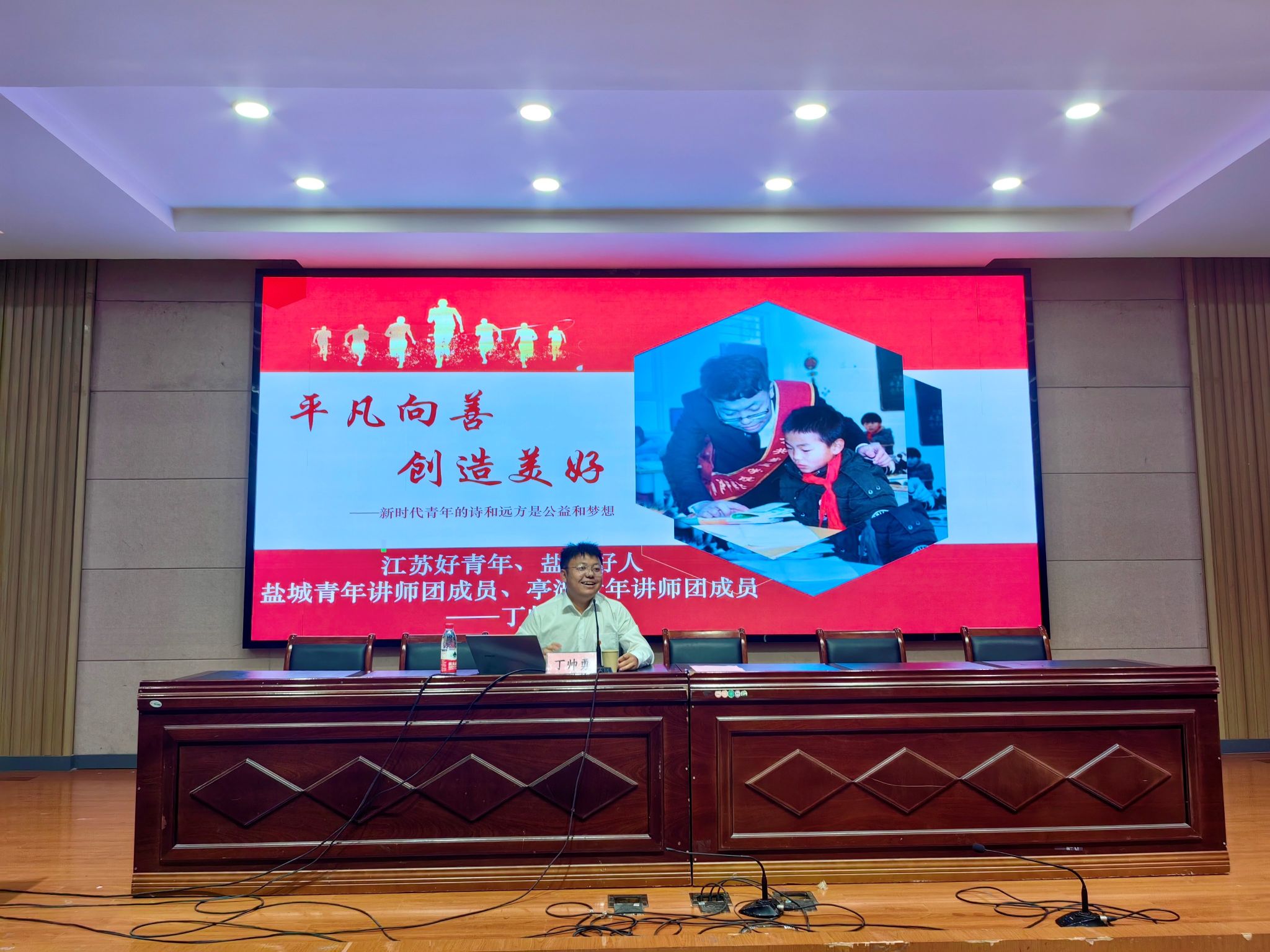 活动最后,丁帅勇为全体学生作《平凡向善,创造美好——新时代青年的诗和远方是公益和梦想》报告。报告中,他详细讲述了自己的志愿服务工作历程,并结合实际案例表达了在参与志愿服务过程中的感悟和收获。他表示,青年参与志愿服务活动不仅是激发社会活力、创新社会治理、促进社会和谐的重要力量,也是培育青年自觉践行社会主义核心价值观、传递社会关爱、促进社会文明的有效途径。希望广大青年大学生积极行动起来,在助老助残、关爱青少年、基层社会治理等领域持续贡献青春力量。