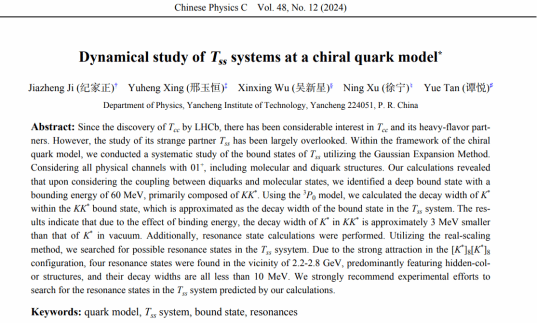 近日,我校数理学院谭悦老师指导学生纪家正利用手征夸克模型预言了Tcc的伙伴态Tss态。相关结果以“Dynamical study of Tss systems at a chiral quark model”为题发表在《Chinese Physics C》(IF=3.6,中科院二区)杂志上。本科生纪家正为第一作者,数理学院谭悦老师为通讯作者。