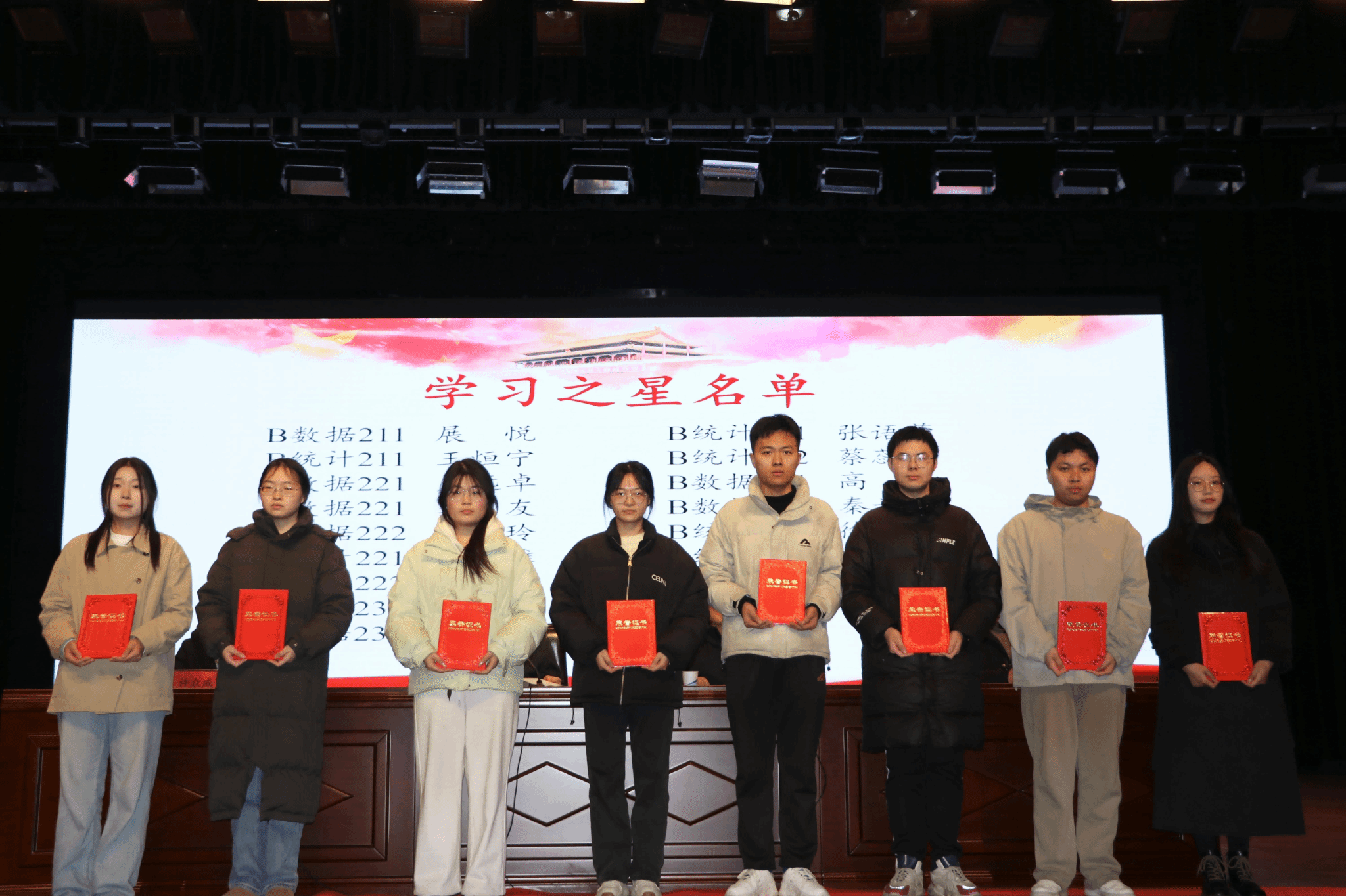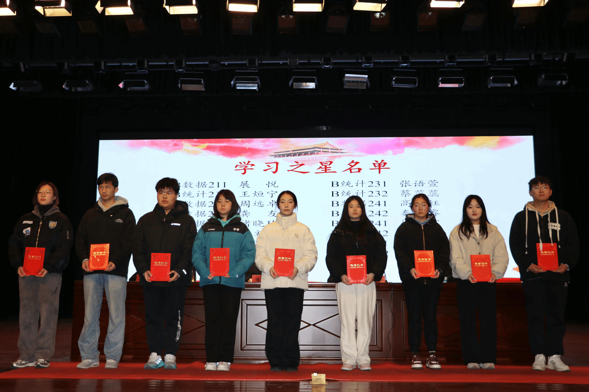 学工办主任孙杰宣读《数理学院学风建设实施方案》2024-2025学年“学习之星”获奖学生分批次上台接受主席台领导颁奖;秦子睿张利军周远卓陈厚铭四学生分别作为各年级学生代表依次登台发言。