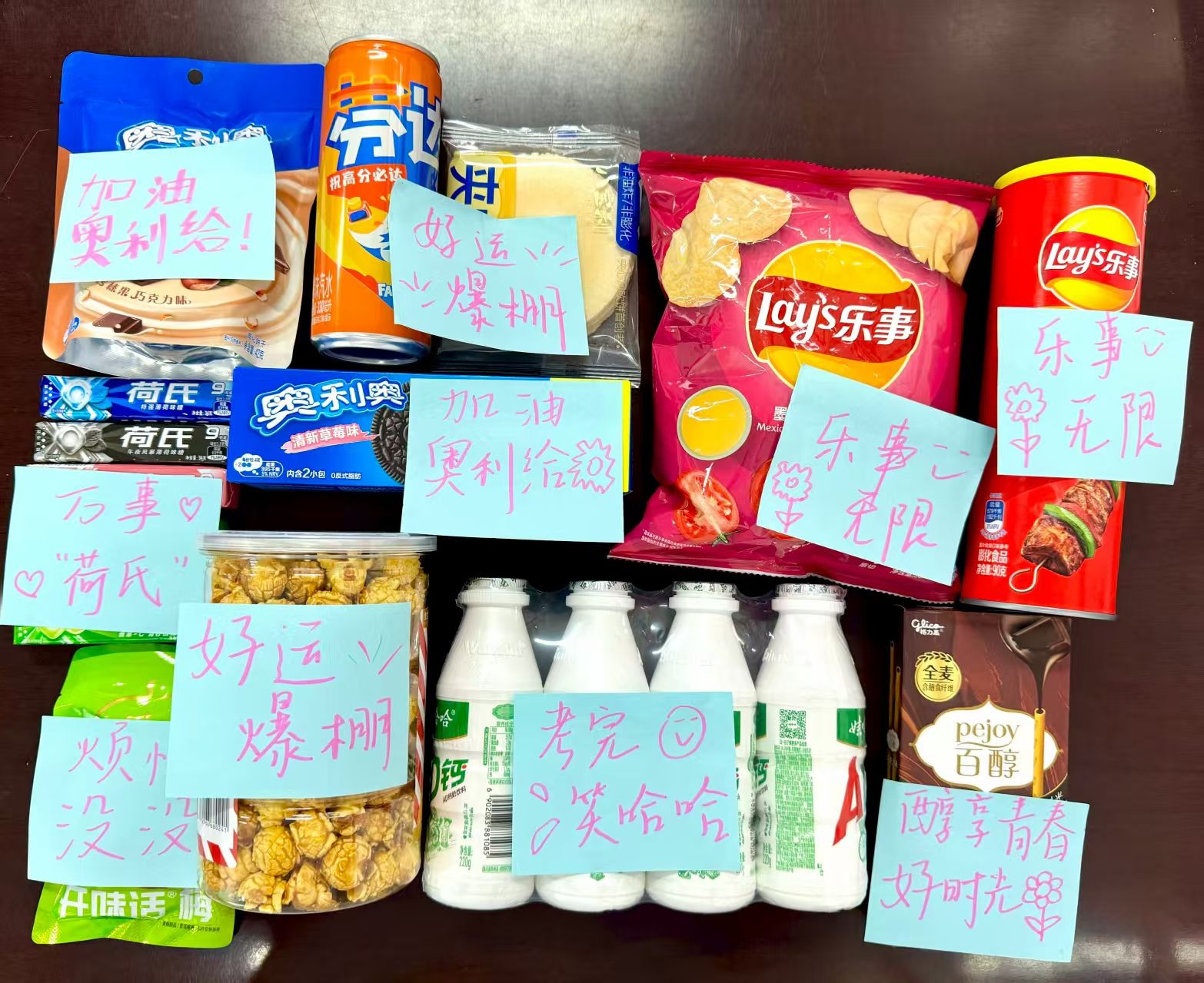 学生代表B数据222班朱钦迟、B统计222班陈丽雯分享了备考期间的心路历程和克服困难的方法,并对学院提供的备考环境与帮扶措施表示衷心感谢。慰问环节中,学院为每位同学送上了“秋天的第一杯奶茶”,并精心准备了装满心意的“考研加油包”。每一份零食都附有手写祝福,字里行间满载学院的牵挂与期盼。